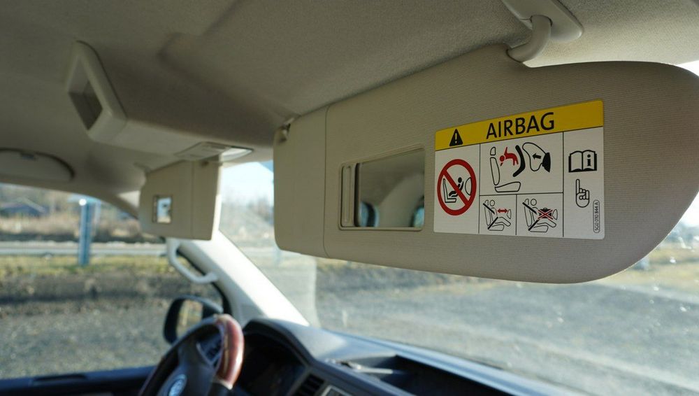 5XR osłony przeciwsłoneczne z lusterkiem, etykietą Airbag na osłonie po stronie przedniego pasażera